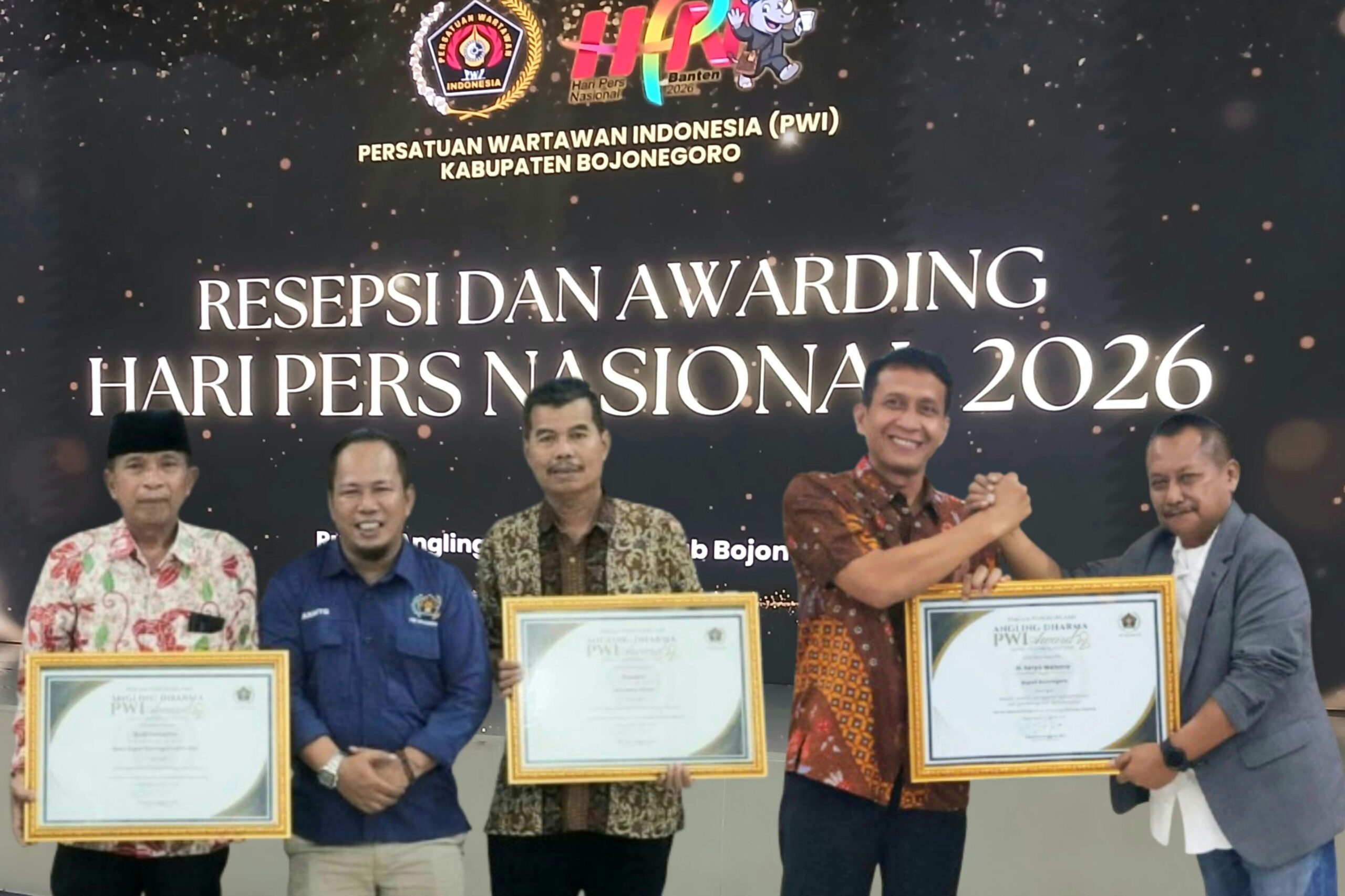 BOJONEGORO, Waskat.id – Persatuan Wartawan Indonesia (PWI) Kabupaten Bojonegoro memberikan anugerah Angling Dharma Award kepada Bupati Bojonegoro, Setyo Wahono, serta 18 pejabat dan tokoh masyarakat yang aktif berkontribusi dalam pembangunan di Kabupaten Bojonegoro. Penyerahan anugerah dikemas apik dalam perhelatan Peringatan Hari Pers Nasional (HPN) 2026, di Ruang Angling Dharma, Pemkab Bojonegoro, Jawa Timur, Jumat (27/3/2026) malam.