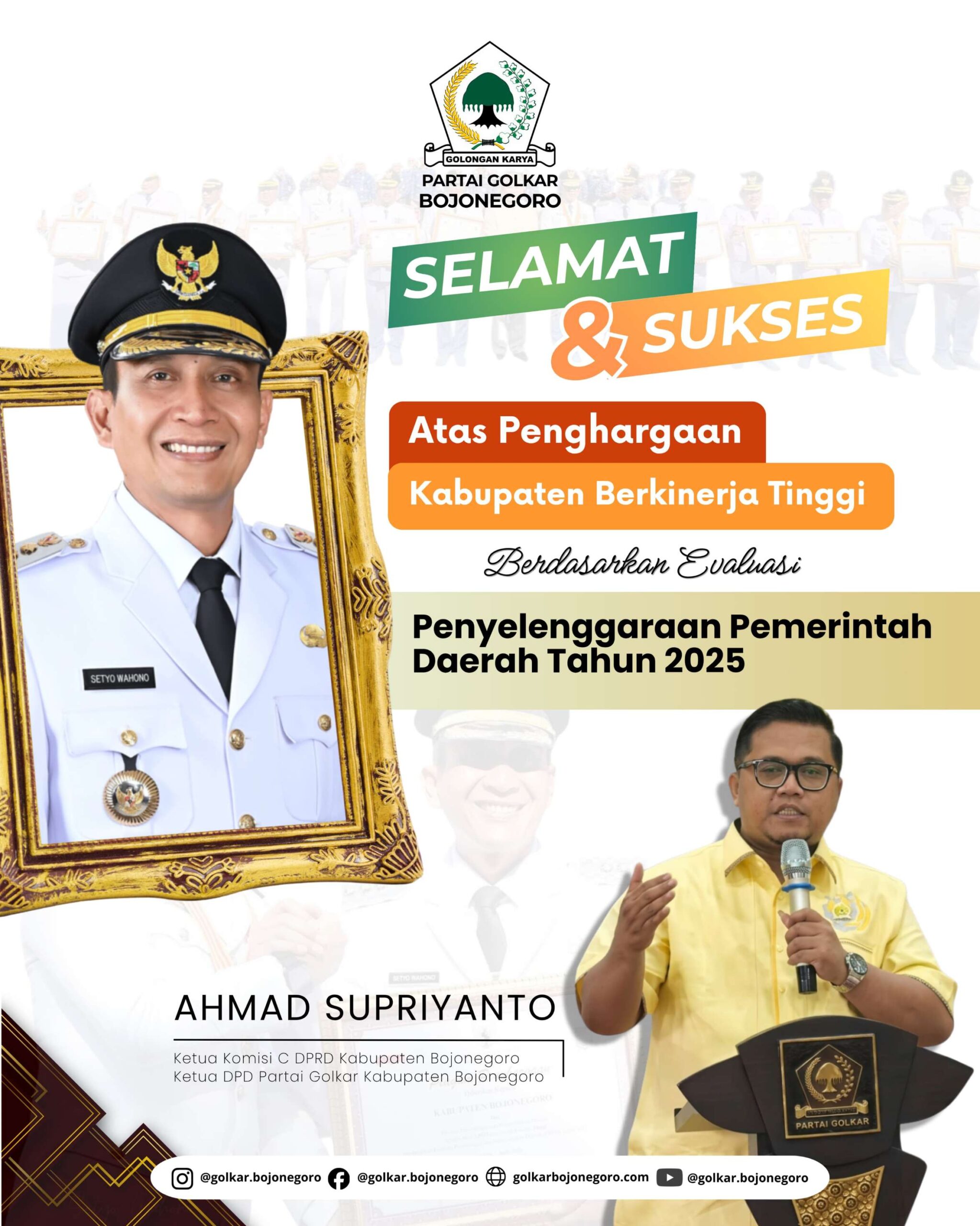 BOJONEGORO, Waskat.id – Ketua DPD Golkar Bojonegoro yang juga Ketua Komisi C DPRD Bojonegoro, Ahmad Supriyanto, memberikan apresiasi setinggi-tingginya kepada Pemkab Bojonegoro beserta jajaran eksekutif yang meraih penghargaan Penyelenggaraan Pemerintahan Terbaik 2025 setelah sukses mewujudkan Asta Cita Pemerintahan Presiden Prabowo Subianto – Gibran Rakabuming Raka.
